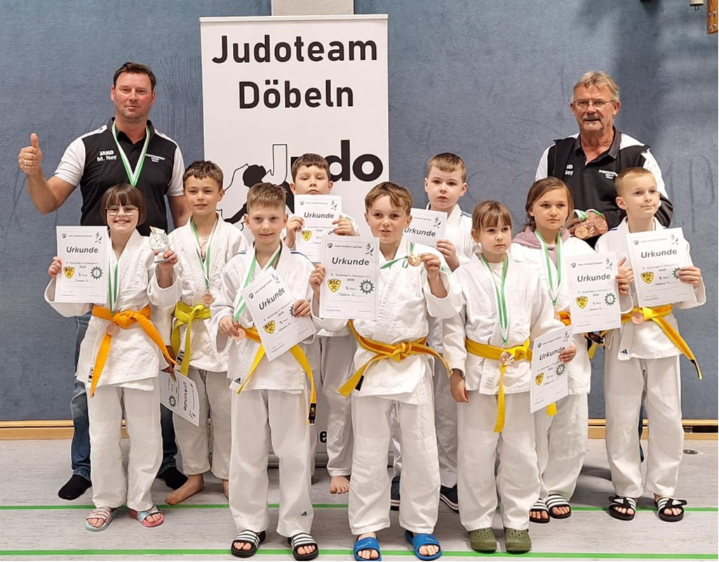 Aber von vorn. Neun Judoka vom Döbelner SC reisten heute mit ihren Trainern Marcel und Henry Ney sowie einigen Fans nach Freiberg. Nach dem ersten Kampftag vor gut einem Monat lag unser Kinderteam mit zwei knappen Niederlagen und zwei Siegen auf Platz 3 der Gesamtwertung mit insgesamt sieben Teams. Somit galt es heute, die Vorrunde abzuschließen und sich möglichst unter den Top 4 zu platzieren, um um die Medaillen mitkämpfen zu können.