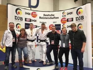 Auch zu diesem Turnier hatten sich die Döbelner gleich mit drei Judoka qualifiziert. Schon zum dritten Mal bei den Deutschen Meisterschaften Julius Enge +100kg, wie auch Georg Ernst -90kg. Zum ersten Mal dabei Christian Schöne -81kg. Zielstellung so gut wie möglich dagegenhalten und gut mitkämpfen. Mit etwas Glück schafft man vielleicht auch einen zweiten oder dritten Auftritt, was Julius ja schon so miterleben durfte. Außerdem freute man sich über alte Bekannt. So kämpften auch bis 90kg die beiden Brüder Hannes und Robert Conrad mit um die Deutsche Meisterschaft. Im Ko System mit doppelter Trostrunde musste man hoffen das bei einer Niederlage sein Bezwinger es bis zum Viertelfinale schafft um in der Trostrunde weiterkämpfen zu können. Alle drei verloren ihren ersten Kampf und so blieb das Hoffen welches sich an diesem Tage nicht erfüllen sollte. Hannes und Robert hingegen konnten nach einer Niederlage in der Hoffnungsrunde weiterkämpfen. Da sie nicht gegeneinander antreten mussten, konnten beide wenn alle weiteren Kämpfe in der Hoffnungsrunde gewonnen werden, den dritten Platz erkämpfen. So standen sie zum ersten Mal gemeinsam Schulter an Schulter auf dem Podest. Reger Nachrichtenaustausch über WhatsApp über Duisburg im Livestream und den Landeseinzelmeisterschaften in Rammenau fand statt um immer auf dem Laufenden zu sein.