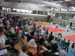 In diesem Jahr waren immerhin 365 Starterinnen aus Sachsen-Anhalt und Sachsen gemeldet, rund 300 Kinder mit ihren Eltern und Betreuern waren letztendlich angereist und kämpften bei hochsommerlichen Temperaturen in der Stadtsporthalle. Dem Gastgeber und Veranstalter bot sich eine Kulisse, die sonst nur bei Spielen der HSG Neudorf/ Döbeln zu erleben ist - in dem Zusammenhang - Dank an die Handballer, die freundlicherweise ihr Freitagstraining sausen ließen. So konnte das Org.- Team die Vorbereitungen und den Aufbau der rund 500 Quadratmeter großen Judomatte (Tatami) schon am frühen Vorabend der Veranstaltung abschließen. In den Altersklassen U10 (Jahrgang 2004-2003) und U12 (Jahrgang 2002-2001) kämpften 299 Mädchen und Jungen in 47 Gewichtsklassen. Von Kamenz bis Werdau, von Aue bis Wolfen waren sie angereist, einige von ihnen hatten gerade soeben die notwendige Prüfung zum weiß-gelben Gürtel abgelegt und sammelten erste Wettkampferfahrungen. Andere wiederum kämpften bereits technisch stark wie ihre "großen Sportkameraden" bei den parallel stattfindenden Europameisterschaften im russischen Tscheljabinsk. Am besten kämpfte die 33-köpfige Mannschaft von RANDORI Leipzig-West, die 4 Gold-, 8 Silber- und 9 Bronzemedaillen ergatterte und mit 50 Punkten souverän den Wanderpokal gewannen. Platz zwei ging an den Judoclub Leipzig (5 x Gold, 3 x Silber, 4 x Bronze, 38 Punkte) gefolgt vom VfL Riesa (4 x Gold, 4 x Silber, 5 x Bronze, 36 Punkte) auf Rang drei.