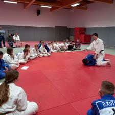 Praxisnah wie hier im Bild zusehen, zeigt Nico die Kriterien welche erfüllt sein müssen um z.B. eine Wertung Waza-ari (einen halben Punkt) zu erhalten. Alle Fragen von Trainer und Aktiven wurden praxisnah demonstriert und von Nico erläutert.