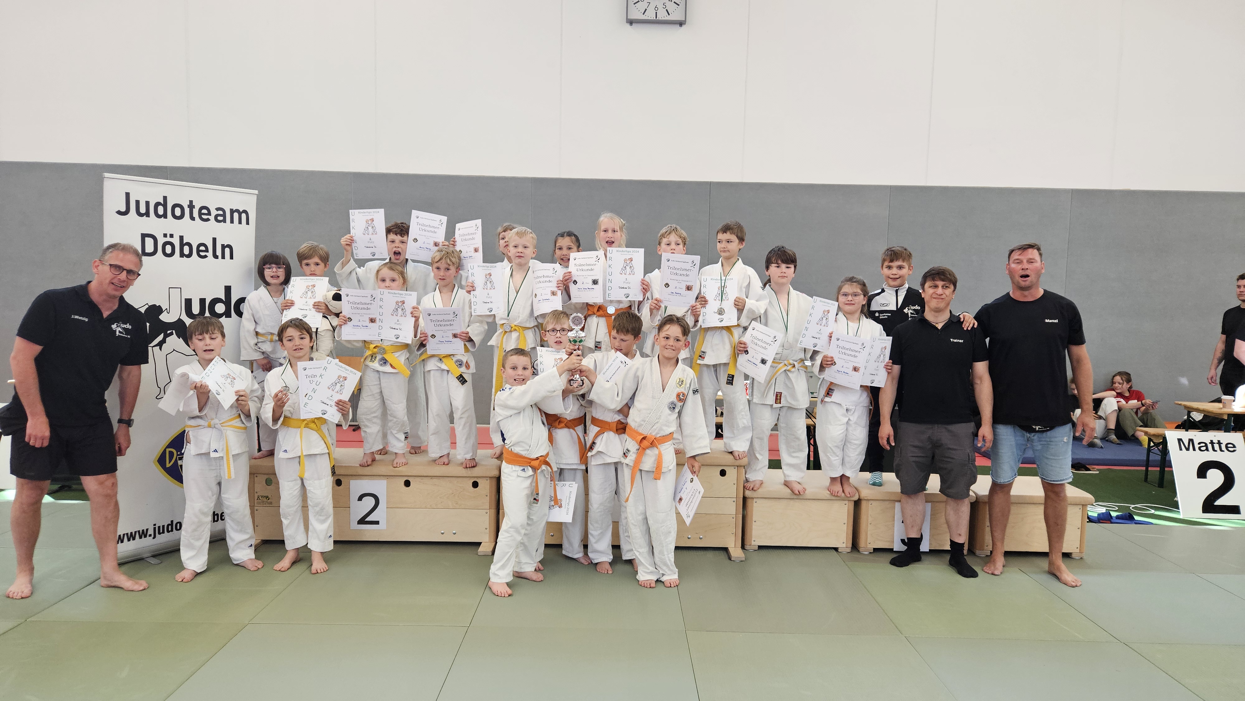 Nun kam es auf die Ergebnisse der anderen Vereine an, auf welchem Platz unsere Judoka am Ende landen würden. Der JSV Werdau gewann am heutigen Tag alle Begegnungen und belegte mit nur einer Niederlage in allen acht Duellen Platz 1. Dahinter wurde es jedoch wie schon am ersten Kampftag ein Kopf-an-Kopf-„Kämpfen“. Gleich drei Mannschaften (wir, der CPSV und Motor Rochlitz) hatten 12:4 Siegpunkte zu verzeichnen, sodass die Unterpunkte entscheiden mussten. Am Ende hatten wir das Glück auf unserer Seite! Durch unser fleißiges Punktesammeln am heutigen Kampftag hielten wir sowohl Rochlitz (Platz 3) als auch den CPSV (Platz 4) auf Abstand und konnten den Pokal für den 2. Platz entgegennehmen. Damit ging die erste Saison der Chemnitzer Kinderliga mit tollen Kämpfen, toller Stimmung und für uns tollem Ergebnis zu Ende!