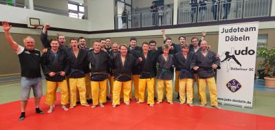 Damit lag nun der Druck auf Fabian Hanke, der neben der Matte als Trainer zwar ein alter Hase ist, für die Mannschaft jedoch in dieser Saison nach 13 Jahren Abstinenz auch seinen Wettkampfjudogi wieder aus dem Schrank holte. Und wie abgebrüht er nun mit dieser Drucksituation umging! Der Freitaler griff mit Ko-Soto-Gake an, den Fabian mir nichts dir nichts einfach mit Uchi-Mata übernahm und sehenswert mit Ippon belohnt wurde. Was für ein Schlusspunkt, was für eine Stimmung in der Halle!